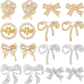 16pcs Small Brooch Buttons for Women, Pearl Rhinestone Lapel Button, Bow Flower Charms for Clothes Sock Shoes Shirt Dress Shawl Hat Decoration 8 Styles- Gold & Silver