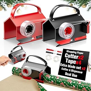 2 Pack Wrapping Paper Cutter & Tape Dispenser Dual Use, Gift Wrap Cutter Tool for Rolls Paper with 4 Tapes & 2 Replace Blades Kit for Christmas Birthday, Easy Cut for Present Wrapping