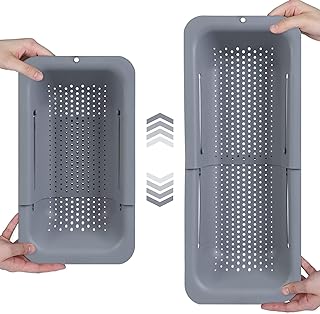 BLUE GINKGO Over the Sink Colander Strainer Basket – Wash Vegetables and Fruits, Drain Cooked Pasta and Dry Dishes – Extendable – New Home Kitchen Essentials (7.9W x 14-19L x 2.75H) – Gray